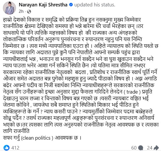 उनले अदालत अहिले सरकारमा रहेका राजनीतिक नेतृत्वको बदला, प्रतिशोध र राजनीतिक स्वार्थ पूर्ति गर्ने औजारसमेत बन्न पुगेको महसुस हुनु ज्यादै पीडाको विषय भएको बताएका छन् । उनले फेशबुकमार्फत आफ्नो धारणा सार्वजनिक गर्ने क्रममा लेखेका छन्-