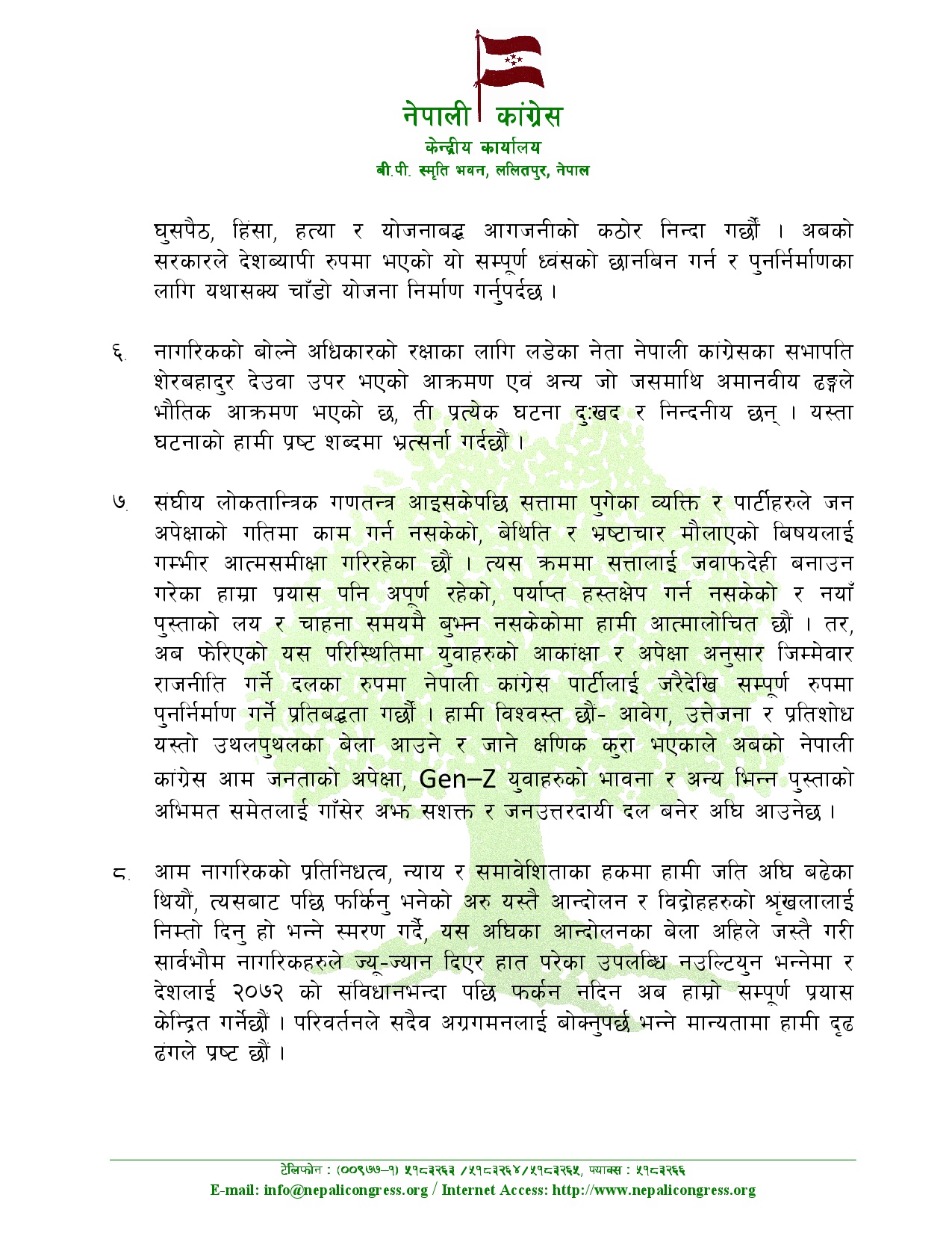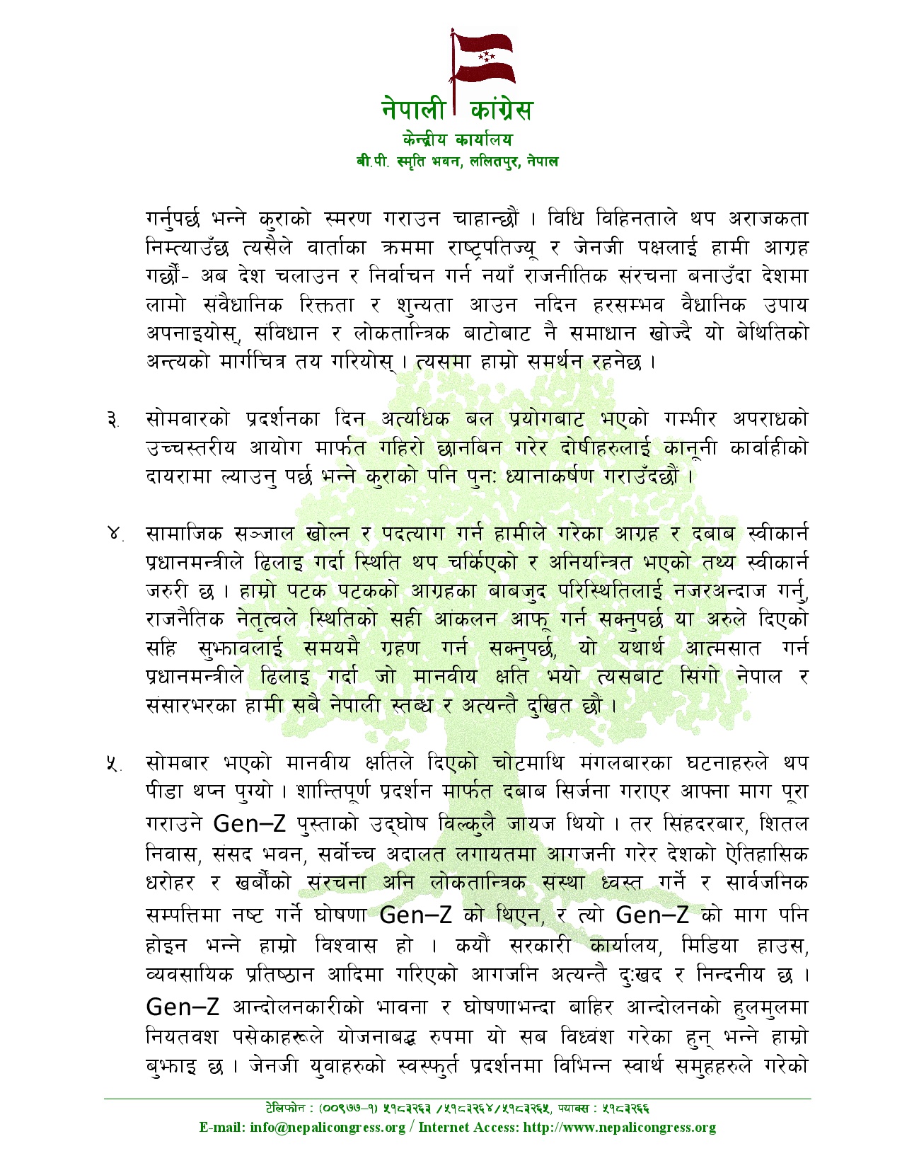 त्यस्तै प्रदर्शनका दिन अत्यधिक बल प्रयोगबाट भएको गम्भीर अपराधको उच्चस्तरीय आयोगमार्फत गहिरो छानबिन गरेर दोषीहरुलाई कानूनी कारबाहीको दायरामा ल्याउन ध्यानाकर्षण समेत गराएका छन्।