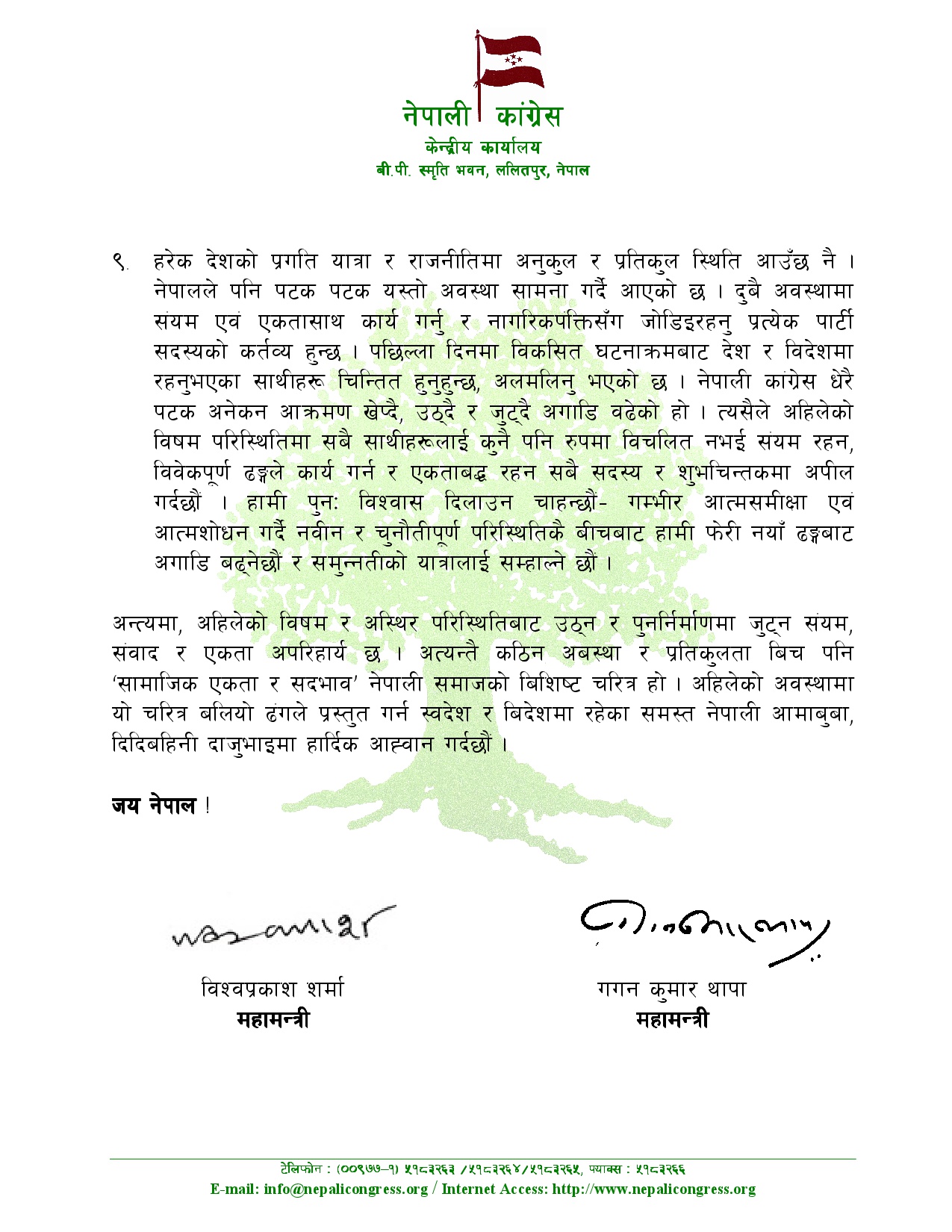देशको समुन्नती र सुन्दर भविष्यका लागि लोकतान्त्रिक प्रणालीको बाटोलाई नवीन ढंगले सुनिश्चित गर्ने गुरुत्तर दायित्वप्रति सबै गम्भीर बन्न आवश्यक रहेको भन्दै मुलुकको सार्थक हित चाहने, शान्ति, सुशासन र समुन्नतिको मार्गमा हिड्न सबै नेपालीलाई आह्वान गरेका छन्।