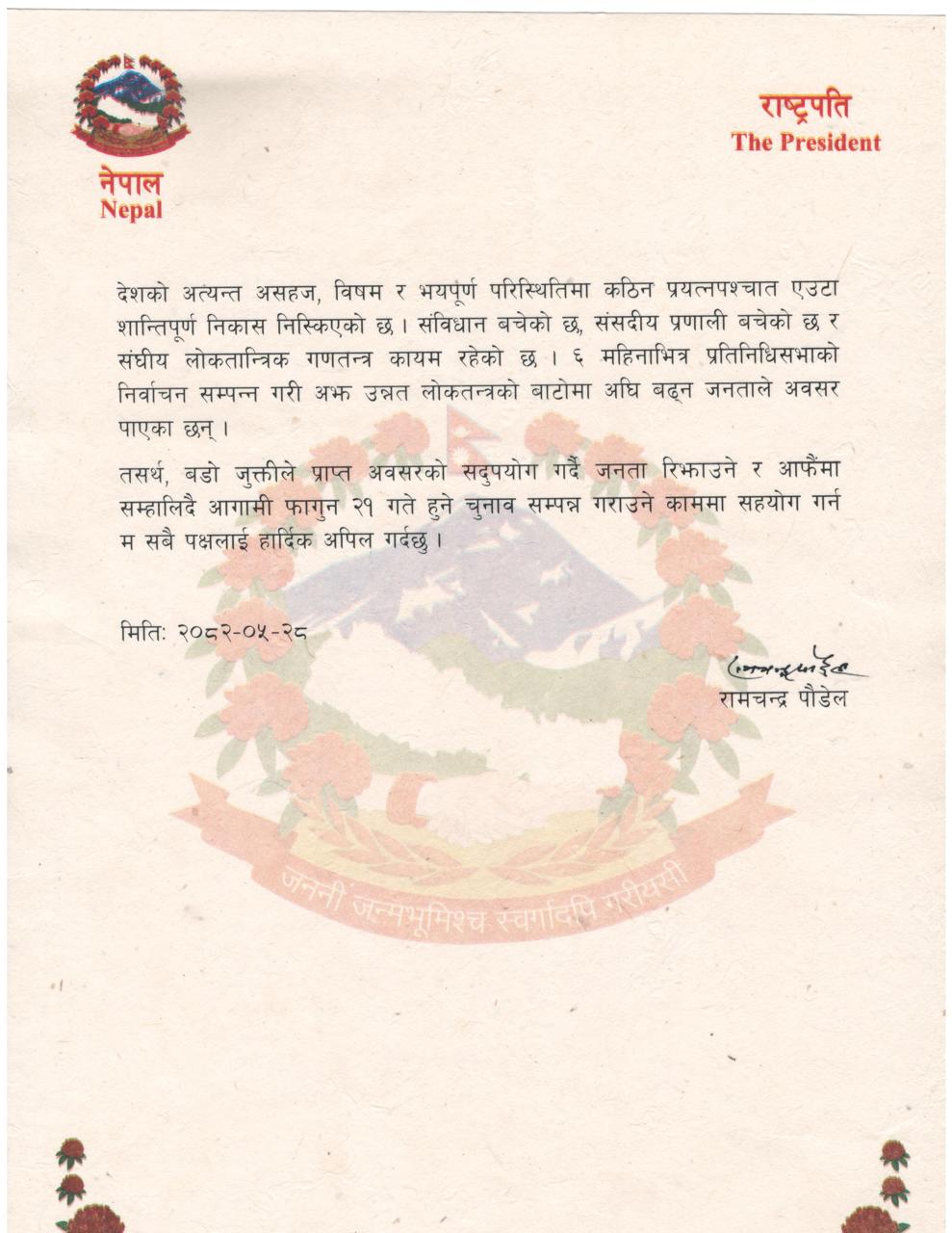 काठमाडौं। राष्ट्रपति रामचन्द्र पौडेलले आगामी फागुन २१ गतेका लागि तोकिएको प्रतिनिधिसभाको निर्वाचन सम्पन्न गराउने काममा सहयोग गर्न सबै पक्षलाई अपिल गरेका छन्।