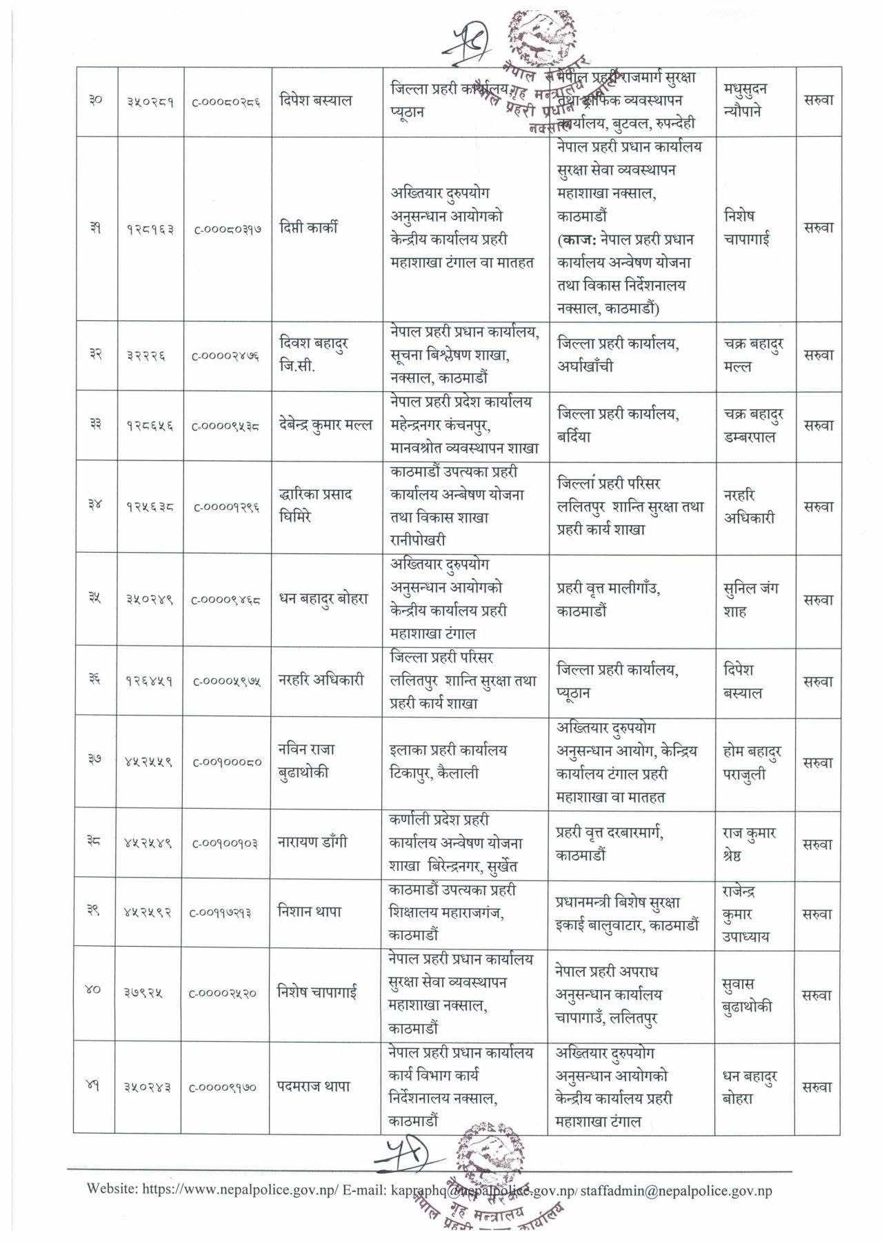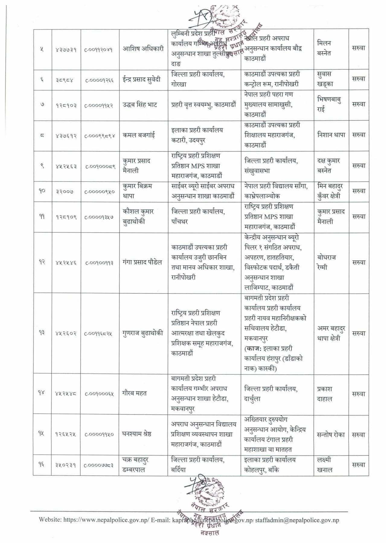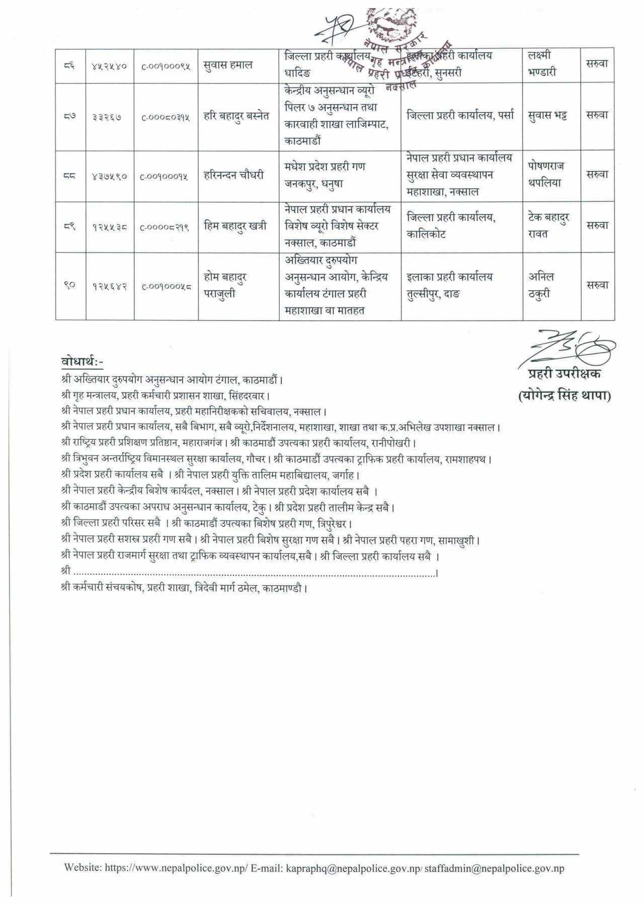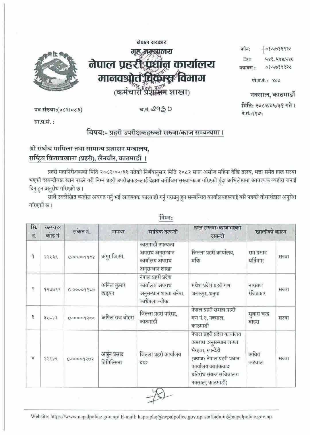 प्रहरी महानिरीक्षकको निर्णयानुसार उनीहरुको सरुवा गरिएको प्रहरी प्रधान कार्यालयले जनाएको छ। मंगलबार उनीहरुको गरिएको हो।