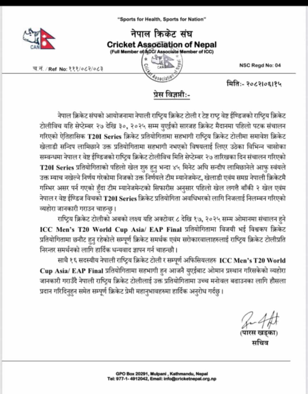 काठमाडौं। वेष्ट इन्डिजविरुद्धको सिरिज नखेलेका सन्दीप लामिछाने निलम्बनमा परेको खुलेको छ।