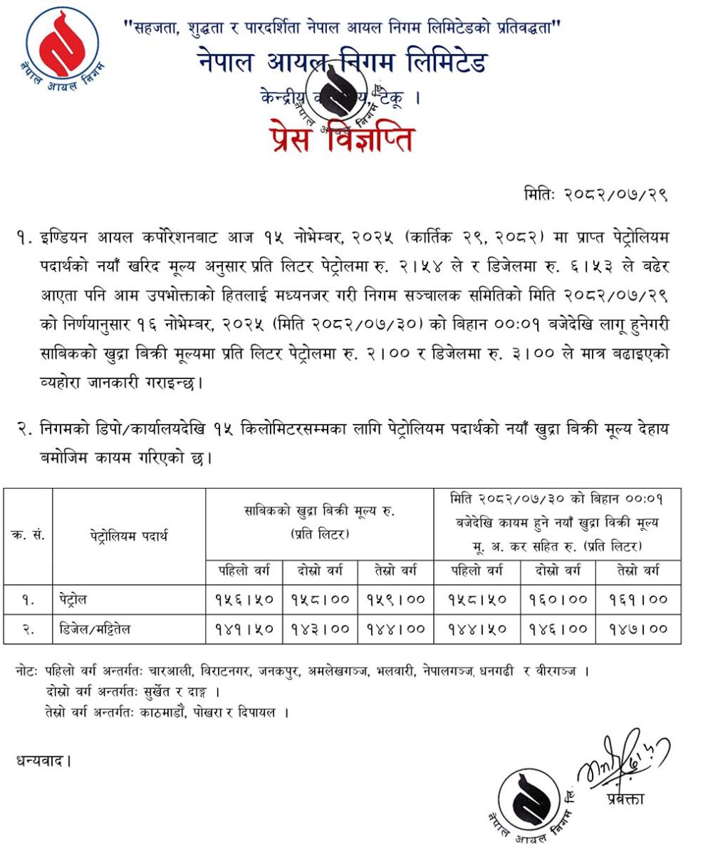 निगमका अनुसार भारतबाट पेट्रोलमा २.५४ रुपैयाँ र डिजेलमा ६.५३ रुपैयाँ मूल्य वृद्धि भएर आएको हुँदा त्यस अनुसार आन्तरिक मूल्य बढाइएको हो। मूल्य परिवर्तन पछि काठमाडौं उपत्यकामा पेट्रोल प्रतिलिटर १६१ रुपैयाँ र डिजेल,मट्टीतेल प्रतिलिटर १४७ रुपैयाँ पुगेको छ।