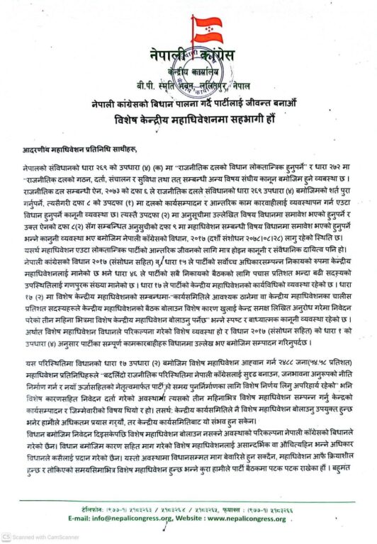 काठमाडौं, २३ पुष । नेपाली कांग्रेसका महामन्त्रीद्वय गगन थापा र विश्वप्रकाश शर्माले विशेष महाधिवेशन आह्वान गरेका छन्। आज (बुधबार) उनीहरुले संयुक्त वक्तव्य जारी गरेर विधानको व्यवस्थाबमोजिम विशेष महाधिवेशनको आह्वान गरेका हुन् ।