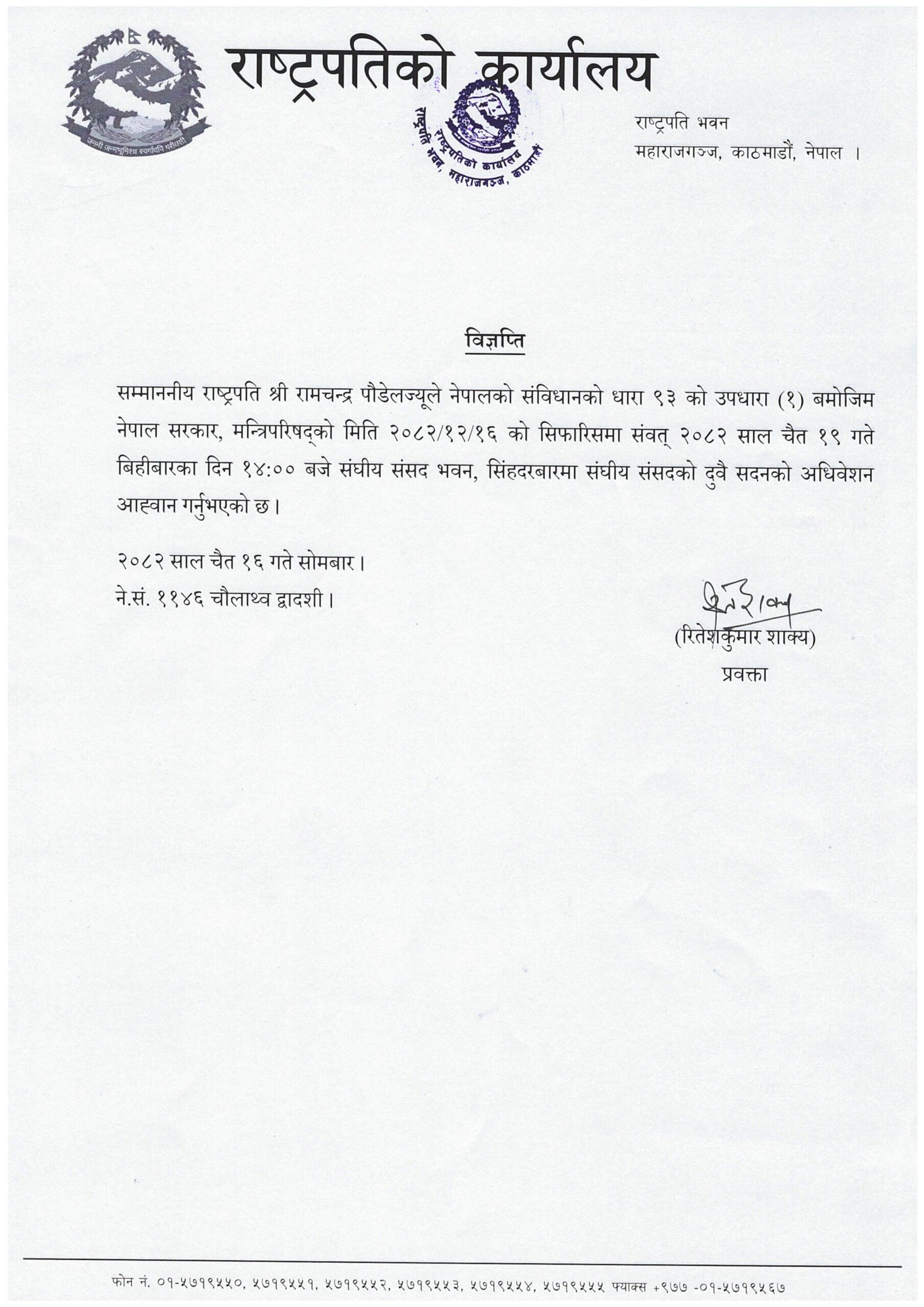 राष्ट्रपति कार्यालयबाट जारी भएकाे विज्ञप्ति अनुसार, संविधानअनुसार, राष्ट्रपति पौडेलले नेपाल सरकार, मन्त्रिपरिषद्को मिति २०८२/१२/१६ को सिफारिस अनुसार संवत् २०८२ साल चैत १९ गते बिहीबार, दिउँसो २ बजे संघीय संसद भवन, सिंहदरबारमा अधिवेशन सञ्चालन गर्न आह्वान गरेका हुन्।